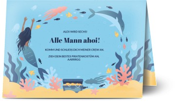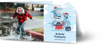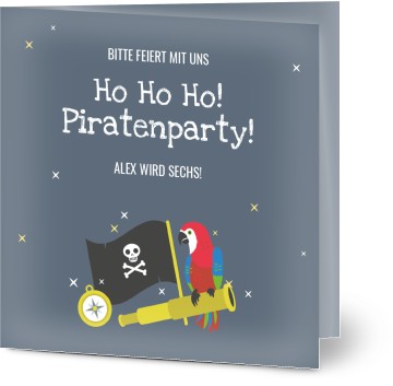 Johoho und beim Klabautermann! Harr, meine Kameraden, plant ihr eine Piratenparty zum Kindergeburtstag eines Jungen? Dann braucht ihr doch sicherlich richtige Piraten-Einladungen. Ist das ein Pirat auf dem Foto da? Also, hisst das Großsegel, setzt das Bild auf diese Piraten-Einladungen und vergesst in der Einladung auch nicht den Nichtsnutz! Gut so! Ihre Einladung zu einer Piratenparty können Sie mit einem Foto von Ihrem Kind noch personalisieren und Bilder an andere Stellen verschieben um sie besonders interessant zu gestalten. Eine Vorlage auswählen ist ganz einfach: Auf Ihren Einladungen mit Piraten könnte eine Totenkopfflagge, ein Piratenschiff oder Ihr eigener kleiner Pirat zu sehen sein. Alle Design-Bestandteile können noch individuell angepasst werden. Daher können Sie immer versichert sein, dass Ihre Piraten-Einladung einzigartig und nicht wie andere aussieht – vor allem wenn Sie eigene Fotos hinzufügen. Mehr Text? Kein Problem! Wenn Sie wollen, können die Piraten auf Ihrem Schiff singen, Sie können den Namen Ihres Kindes hinzufügen oder alles, was Ihnen sonst noch einfällt. Keine Einfälle? Natürlich können Sie auch unsere Vorlagen und unsere Formulierungen verwenden. Laden Sie mit unseren Pirateneinladungen alle zu Ihrer Piratenparty ein und Sie werden bestimmt Aufsehen unter den räudigen Hunden mit ihren Papageien und Rumbuddeln erregen!