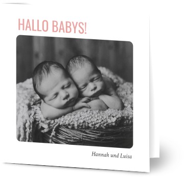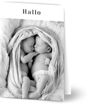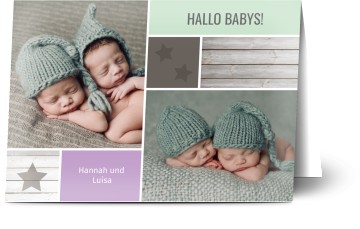 ZWILLINGE! Teilen Sie die Neuigkeit von der Geburt mit all Ihren Freunden mit und erstellen Sie hierfür individuelle Karten zur Geburt von Zwillingen mit Fotos und einer persönlichen Botschaft. Karten zur Geburt Ihres Babys sind nämlich viel persönlicher und viel aussagekräftiger, wenn sie ein Foto Ihrer Zwillinge enthalten. Gestalten Sie also Ihre Babykarten mit eigenen Fotos und einer ganz persönlichen Botschaft und wir werden sie auf Material von Top-Qualität drucken. Sie können eine Vorlage auswählen, Ihre Fotos kostenlos hochladen und das Layout anschließend so lange immer wieder verändern bis es perfekt ist. Keine Einfälle? Kein Problem, wir haben Dutzende von Vorlagen aus denen Sie sich eine aussuchen und in die Sie Fotos von Ihren Zwillingen hochladen können, um sie an der richtigen Stelle zu platzieren. Erstellen Sie eine besondere Ankündigungs- oder Glückwunschkarte zur Geburt, indem Sie eine unserer Vorlagen auswählen und Ihren Vorstellungen entsprechend anpassen. Karten zur Geburt Ihrer Zwillinge mit einem Bild von den zwei Wonneproppen erlangen sofort Erinnerungswert. Sei es dass Sie selbst eine Karte zur Geburt Ihres Babys gestalten oder eine Vorlage verwenden, Ihre Zwillingsgeburtsanzeigen sollten etwas Besonderes sein. Etwas Besonderes werden sie, wenn Sie etwas durch und durch Individuelles kreieren. Wir drucken auf Materialien von Top-Qualität; Sie können daher stets versichert sein, dass Sie Karten zur Geburt von Zwillingen von hoher Qualität sind und fantastische Farben erhalten.
